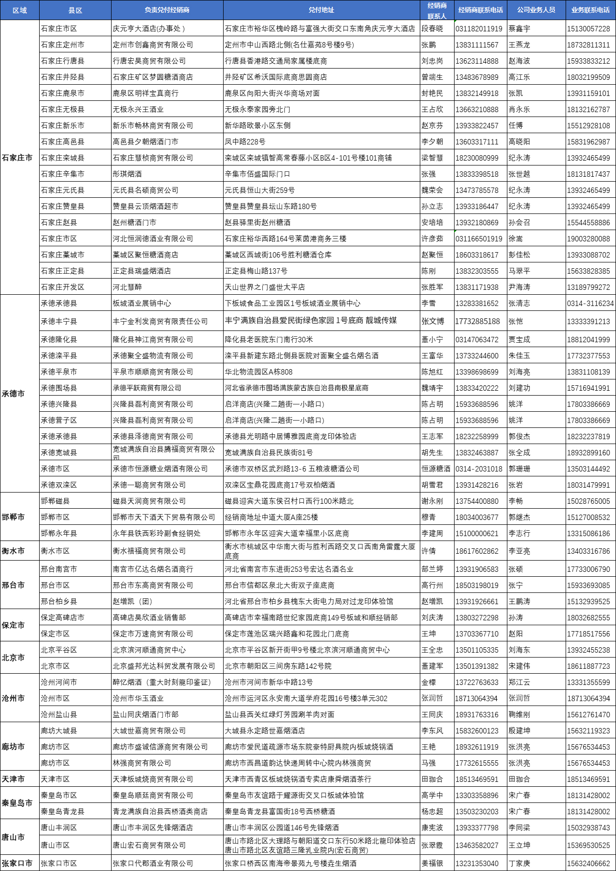 板城酒業(yè)公司定制酒票兌付地點(diǎn)一覽表