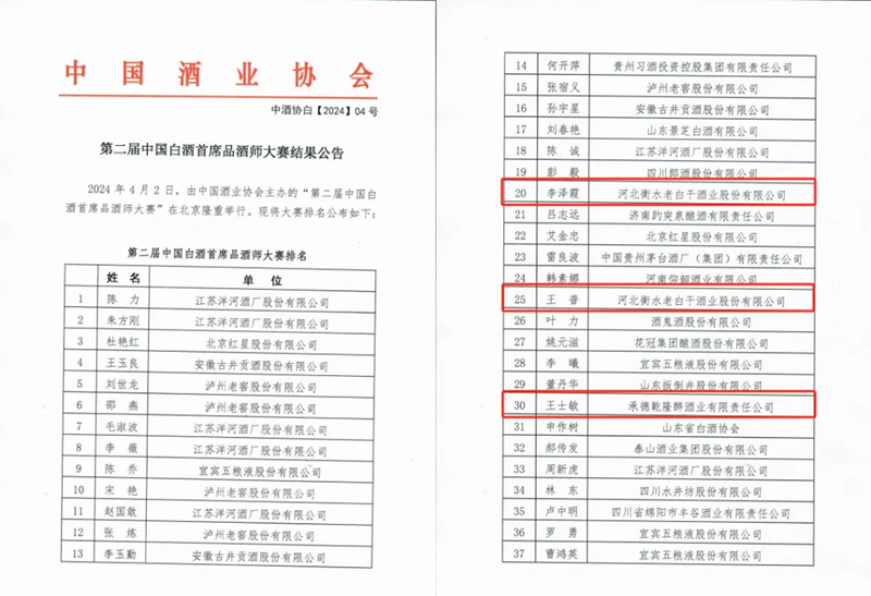 2024年4月2日,由中國酒業(yè)協(xié)會主辦的“第二屆中國白酒首席品酒師大賽”在北京隆重舉行。衡水老白干在原有李澤霞一位中國白酒首席品酒師的基礎(chǔ)上,又添王普、王士敏兩位中國白酒首席品酒師。