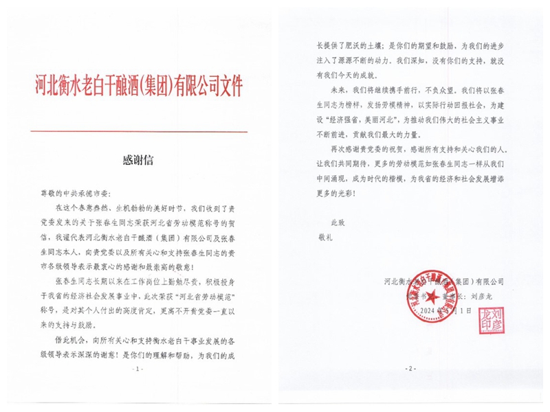 河北老白干釀酒集團在感謝信中寫到:“張春生同志長期以來在工作崗位上勤勉盡責(zé),積極投身于我省的經(jīng)濟社會發(fā)展事業(yè)之中,此次榮獲河北省勞動模范,是對其個人付出的高度肯定,更離不開承德市黨委一直以來的支持與鼓勵。我們將以張春生同志為榜樣,發(fā)揚勞模精神,以實際行動回報社會,為建設(shè)經(jīng)濟強省,美麗河北,貢獻我們最大的力量”。