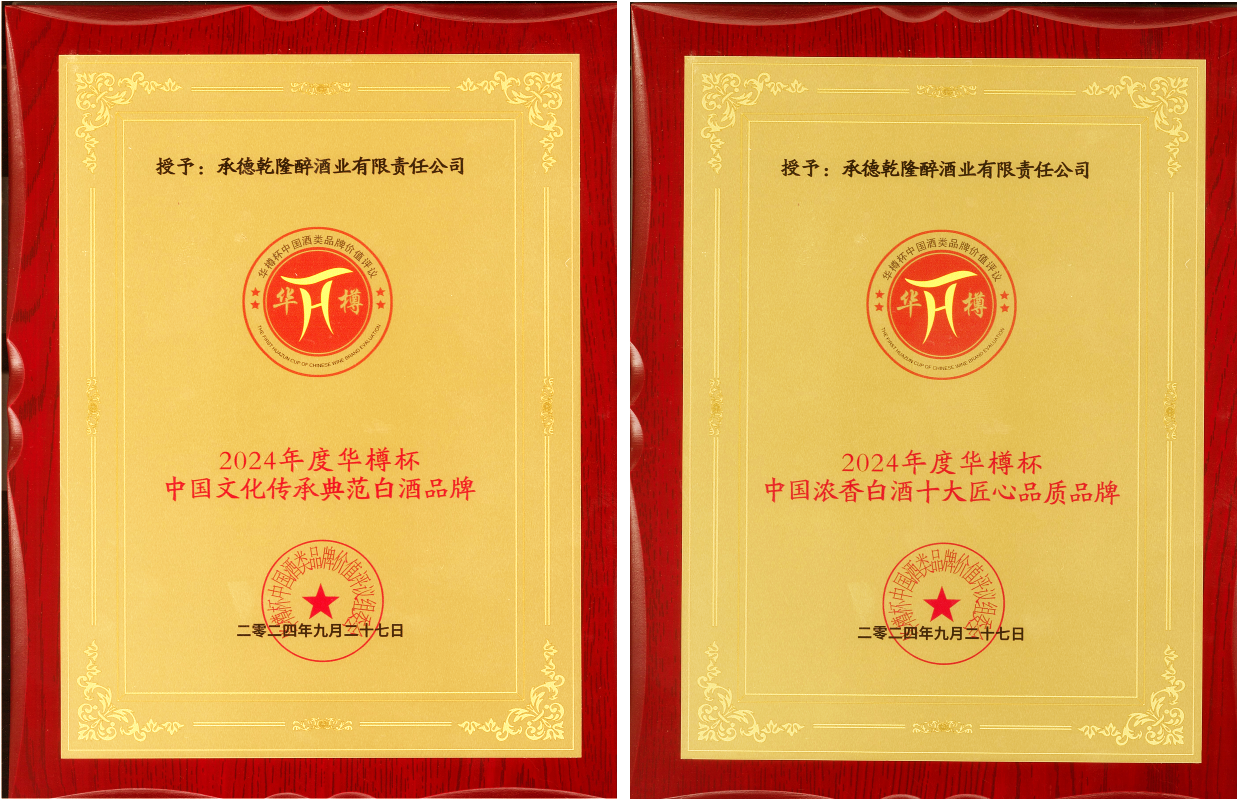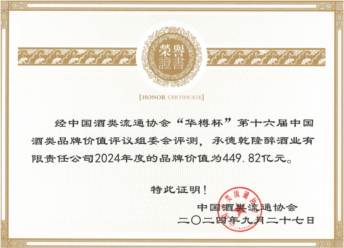 板城酒業(yè)憑借過硬的綜合實力得到行業(yè)肯定及評審專家的認可,經中國酒類流通協(xié)會“華樽杯”第十六屆中國酒類品牌價值評議組委會評測,承德乾隆醉酒業(yè)有限責任公司(板城酒業(yè))2024年度的品牌價值為449.82億元,中國白酒行業(yè)排名三十位,同時,榮獲“2024年度華樽杯中國濃香白酒十大匠心品質品牌”、“2024年度華樽杯中國文化傳承典范白酒品牌”獎項,充分彰顯了冀酒的品質自信,也傳遞出行業(yè)、社會對板城酒業(yè)品牌文化的高度認可。