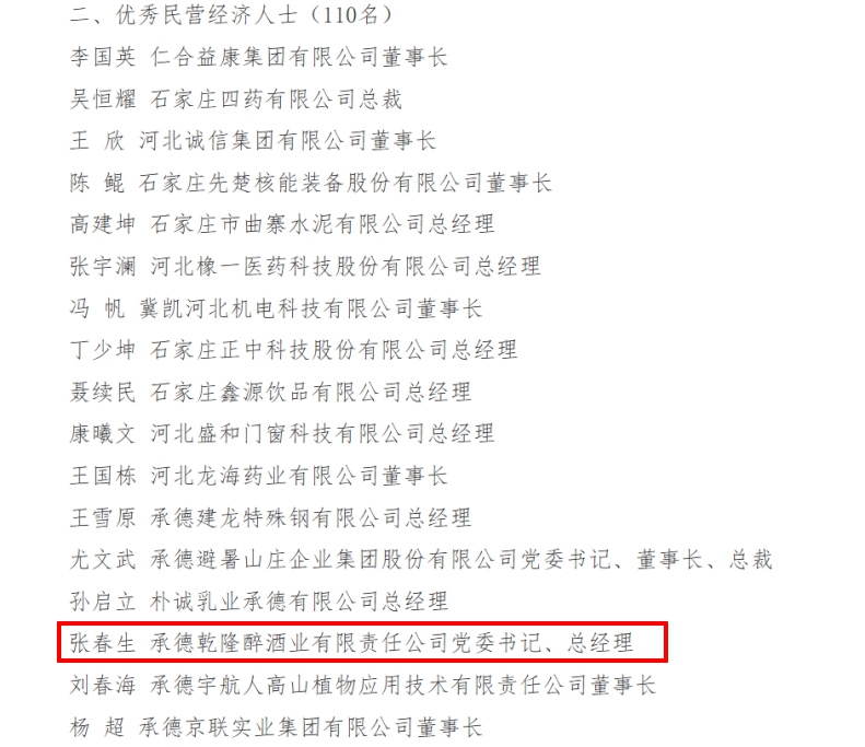 近日,河北省人民政府印發(fā)《關(guān)于表彰2024年度河北省優(yōu)秀民營(yíng)企業(yè)、優(yōu)秀民營(yíng)經(jīng)濟(jì)人士的通報(bào)》(冀政字〔2025〕14號(hào)),板城酒業(yè)黨委書記、總經(jīng)理張春生憑借卓越的領(lǐng)導(dǎo)力和對(duì)區(qū)域經(jīng)濟(jì)發(fā)展的突出貢獻(xiàn),獲評(píng)“2024年度河北省優(yōu)秀民營(yíng)經(jīng)濟(jì)人士”稱號(hào)。